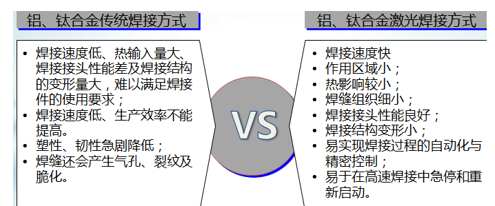 鈦合金主要廣泛用在飛機上,并已由次承力結構件轉為主結構件,鋁合金是運載火箭及各種航天器的主要結構材料。先通過對比鋁合金、鈦合金的傳統焊接與激光復合焊,突顯出激光加工有能量集中、易于操作、高柔性化、節能環保和高質高效等優點。